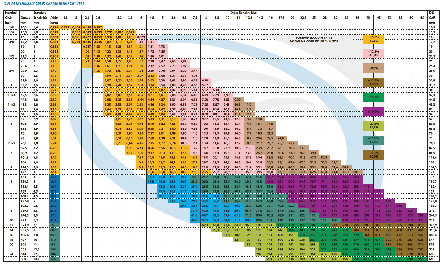 DIN 2448 Dikişsiz çelik boruların ölçüleri ve metre ağırlıkları tanımlanır.